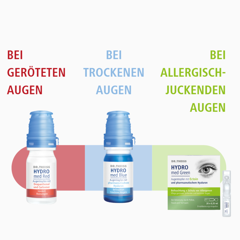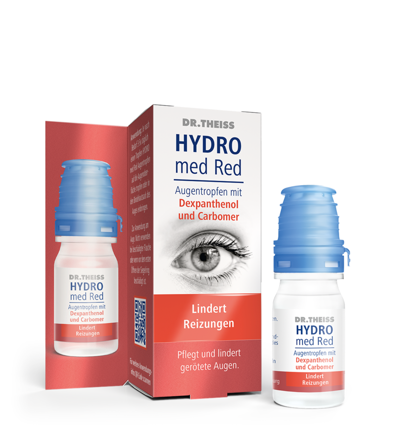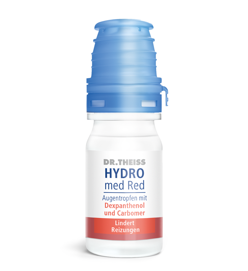 Dr. Theiss HYDRO med Red Augentropfen mit Dexpanthenol und Carbomer bilden einen sterilen, konservierungsmittelfreien, viskoelastischen, klaren Schutzfilm auf der Hornhaut. Dafür sorgt vor allem das Provitamin B5 (Dexpanthenol), das aufgrund seiner hohen Wasserbindungskapazität die Fähigkeit hat, das Auge zu befeuchten und zusätzlich zu pflegen. Unterstützt werden diese feuchthaltenden Eigenschaften des Dexpanthenols durch den Inhaltsstoff Carbomer. Dieser bildet einen Gleit- und Schutzfilm auf der Horn- und Bindehaut und schafft somit einen Ausgleich für fehlende Tränenflüssigkeit. Dr. Theiss HYDRO med Red Augentropfen mit Dexpanthenol und Carbomer schützen und befeuchten die Augenoberfläche und macht sie gleitfähig. Die Beschwerden des Trockenen Auges können vielfältige Ursachen haben und stehen häufig im Zusammenhang mit: