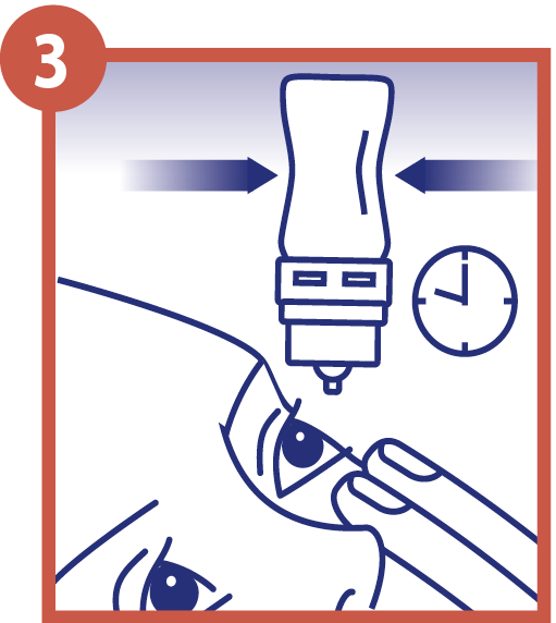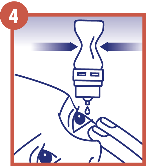 Legen Sie den Kopf etwas zurück, sehen Sie nach oben und ziehen Sie das Unterlied leicht vom Auge ab. Halten Sie die Flasche mit der Tropföff-nung nach unten und geben 1 Tropfen bis zu 3 – 5 mal täglich in den Bindehautsack jedes Auges (3 + 4). Schließen Sie die Augen langsam, damit sich die Flüssigkeit auf der Oberfläche des Auges gleich-mäßig verteilen kann.