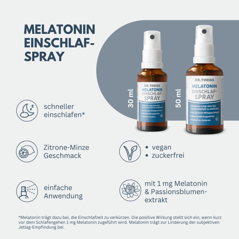 Ein erholsamer Schlaf bietet die Voraussetzung für einen guten Start in den Tag. Stressige Lebensphasen, Schicht- und Nachtarbeit oder lange Flugreisen über mehrere Zeitzonen hinweg, können zu Schlafproblemen führen. Dr. Theiss Melatonin Einschlaf-Spray kombiniert Melatonin mit Passionsblumenextrakt.