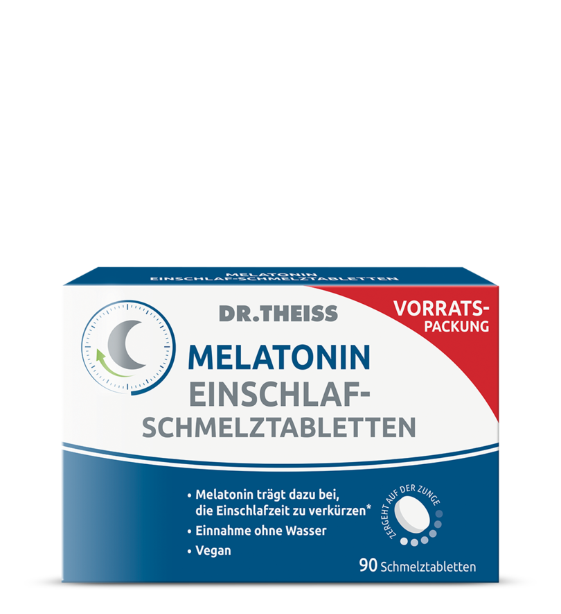 *Melatonin trägt dazu bei, die Einschlafzeit zu verkürzen. Die positive Wirkung stellt sich ein, wenn kurz vor dem Schlafengehen 1 mg Melatonin (1 Schmelztablette) eingenommen wird. Die Schmelztablette zergeht auf der Zunge. Sie kann ohne Wasser eingenommen werden.