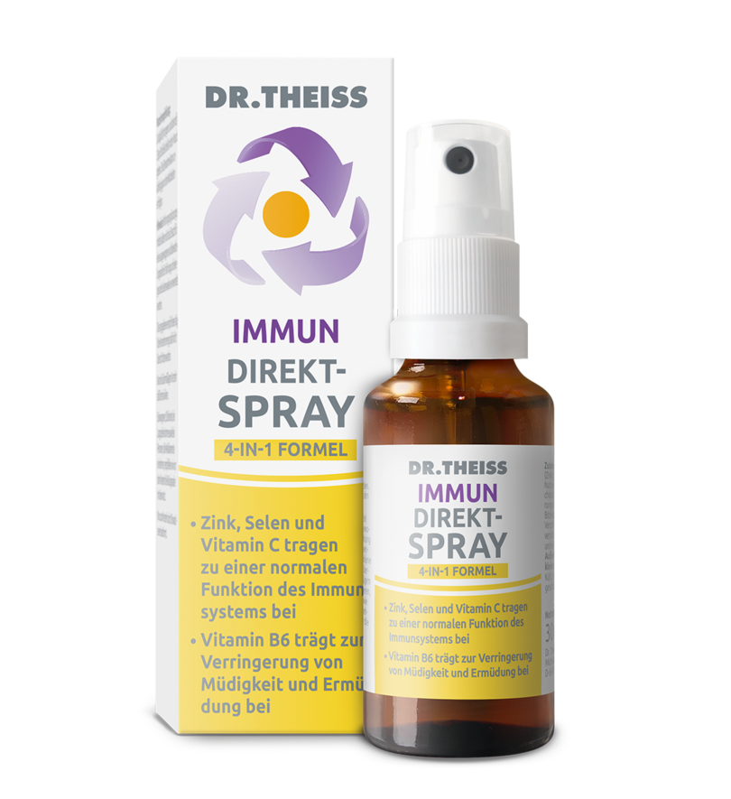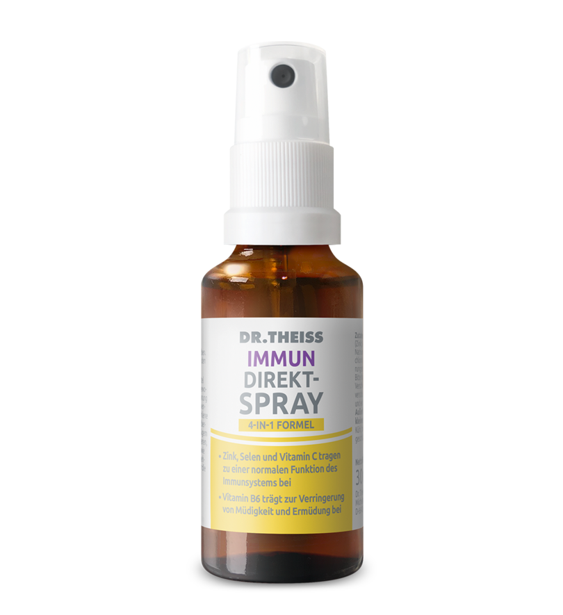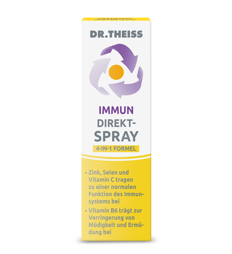 Nahrungsergänzungsmittel mit Mineralstoffen und Vitaminen. Mit Süßungsmitteln. Dr. Theiss Immun Direkt-Spray kombiniert Zink, Selen und Vitamin C mit Vitamin B6. Zink, Selen und Vitamin C tragen zu einer normalen Funktion des Immunsystems (körperliche Abwehr) bei. Vitamin B6 trägt zu einer Verringerung von Müdigkeit und Ermüdung bei. Das leicht anzuwendende Spray ist dank Sprühkopf einfach zu dosieren.